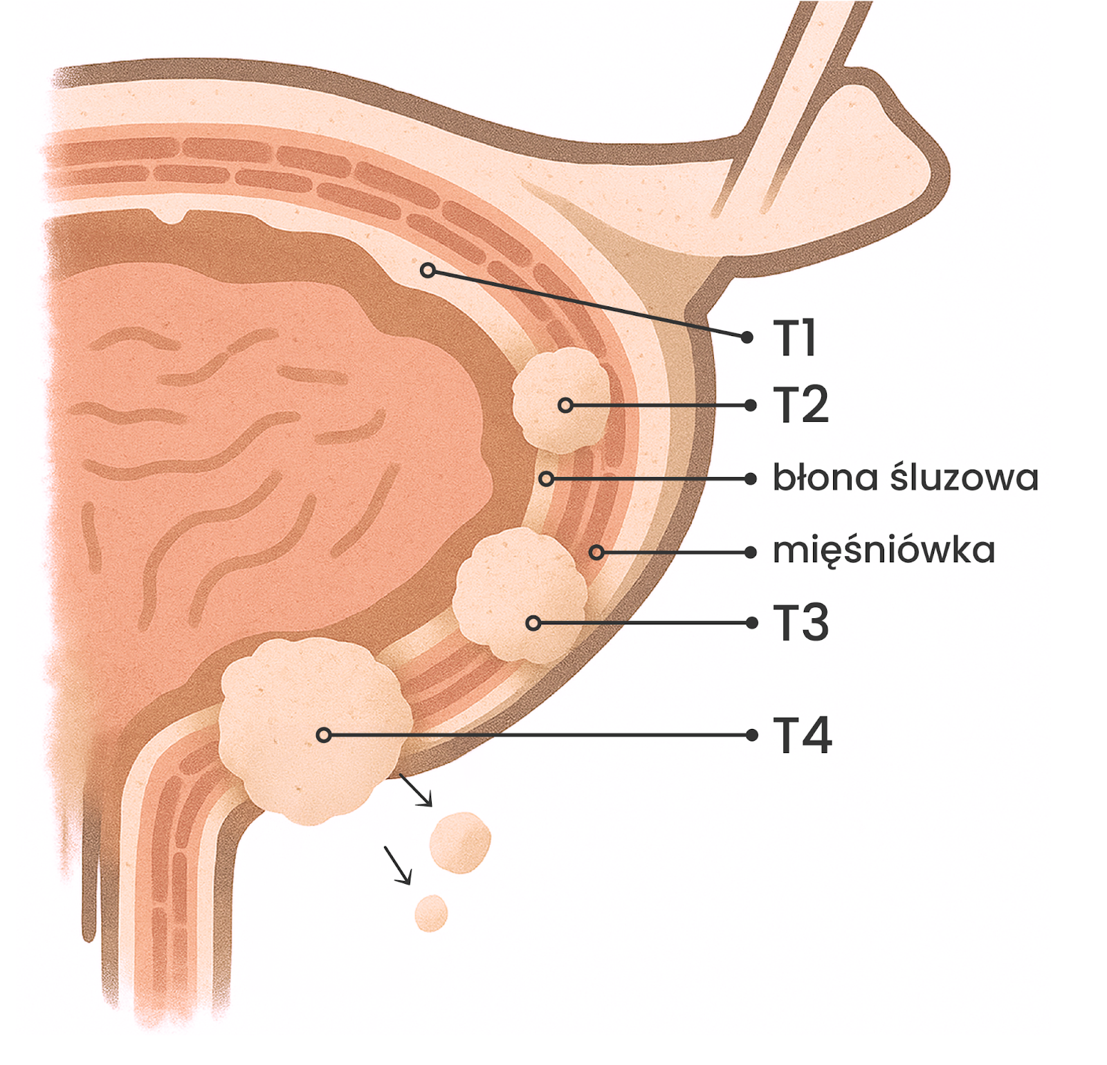 - Stopień I (T1, N0, M0) – rak nacieka tkankę łączną (lamina propria) pod błoną śluzową, ale nie sięga warstwy mięśniowej.